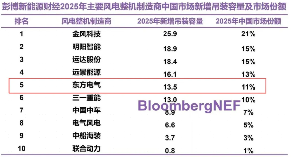 東方風電國內新增吊裝容量排名第五!